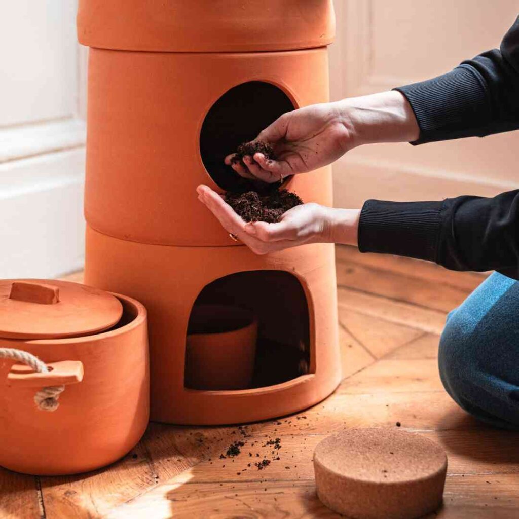 Nous avons fait le choix de la terre cuite plutôt que du plastique, une ressource abondante et renouvelable. Nos composteurs sont conçus artisanalement par nos artisans potiers au Portugal. Ils sont ainsi à la fois écologiques et durables.